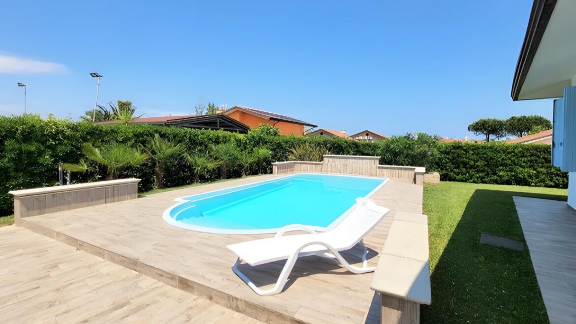 La piscina di recente realizzazione, così come l’intera pavimentazione esterna ben inserita nel grande giardino privato, per una proprietà totale di 680 mq.